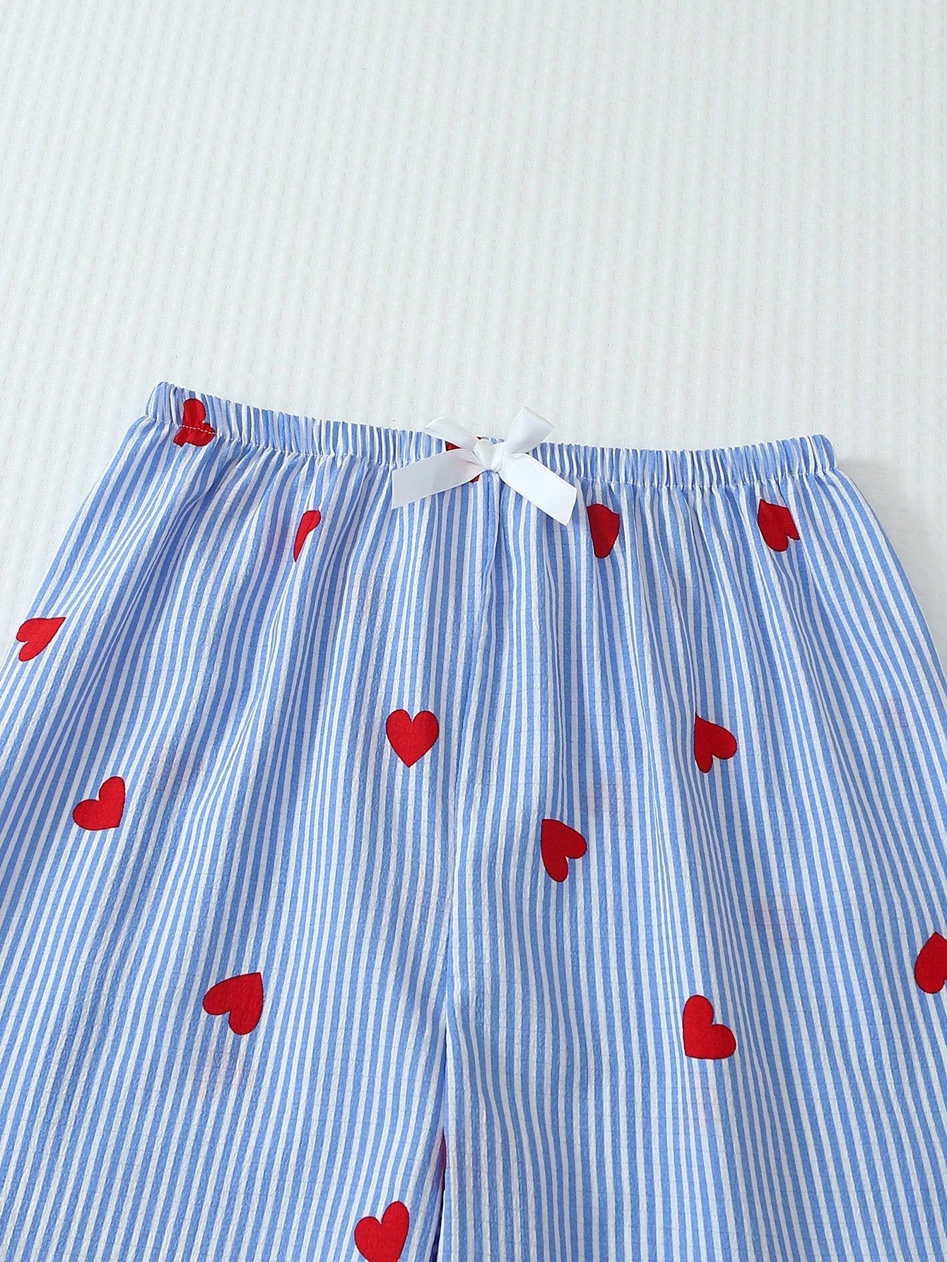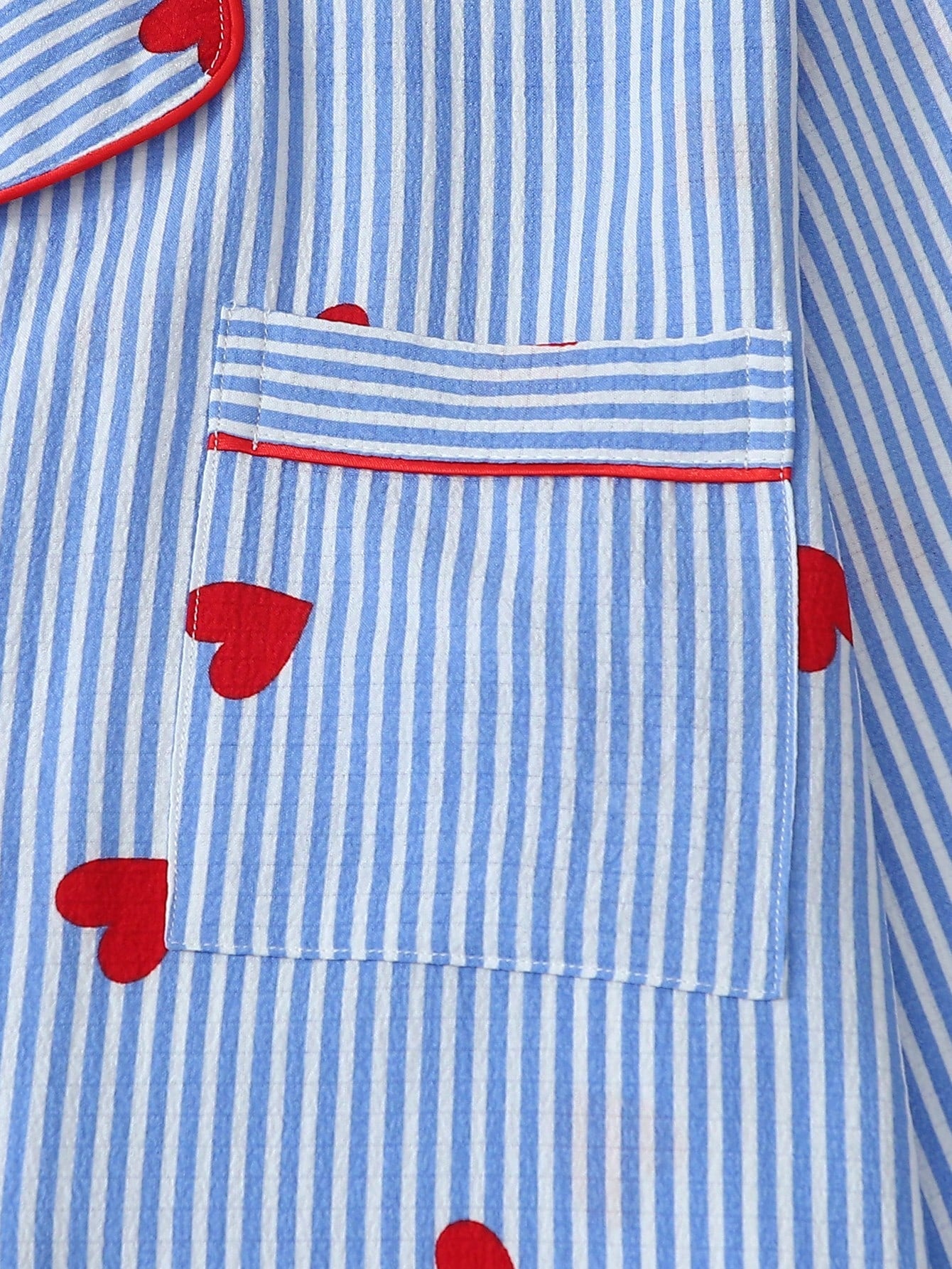 The Blue Heartstripe Classic Pajama Set offers a timeless sleepwear silhouette with a playful, romantic accent. Featuring a crisp blue-and-white vertical stripe base, this two-piece set is finished with an all-over red heart print for added charm. The long-sleeve button-front top includes a notched collar, chest pocket, and contrast red piping for a polished, traditional look. Matching straight-leg pants feature a comfortable elastic waistband with a drawstring tie for an adjustable fit. Soft, breathable, and easy to wear, this set is ideal for everyday sleep, lounging, or gifting.