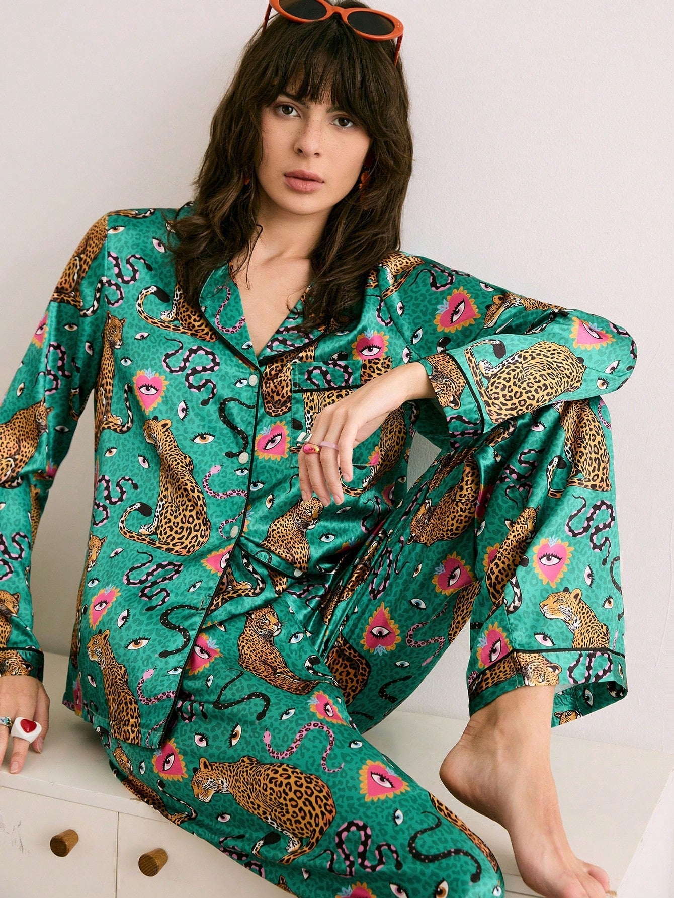 The Emerald Jungle Leopard Satin Pajama Set is a striking blend of bold pattern and luxurious comfort. Designed in a rich emerald green satin, this two-piece set features an artistic jungle-inspired print with leopards, serpentine accents, and whimsical eye motifs, creating a distinctive, fashion-forward look. The long-sleeve button-front top is styled with a classic notched collar, contrast piping, and a chest pocket, paired with matching straight-leg pants for a relaxed yet polished silhouette.